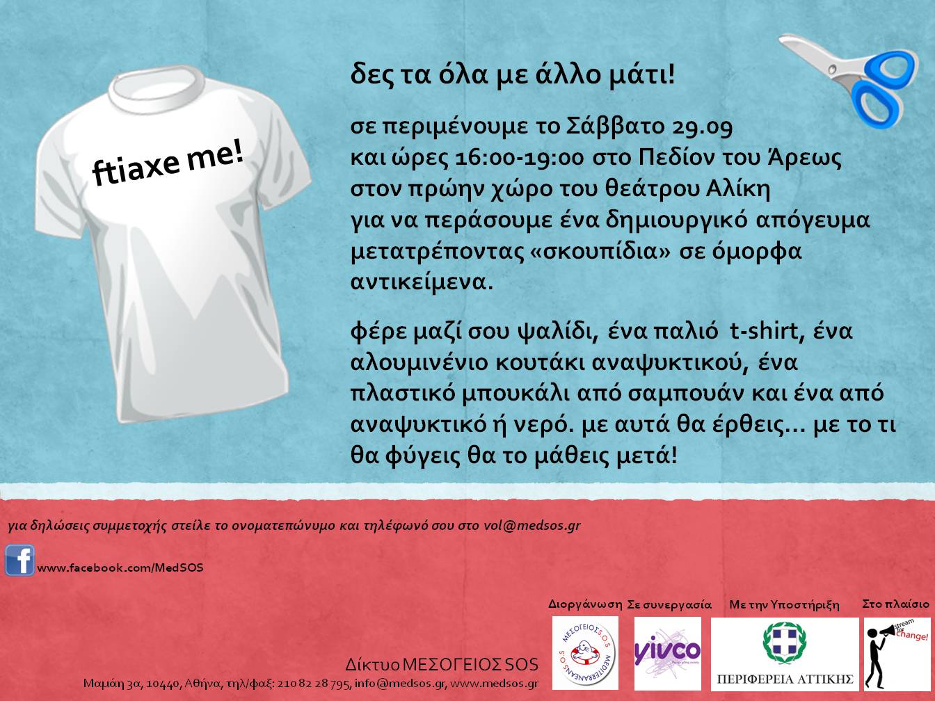 Η Περιφέρεια Αττικής στηρίζοντας τις δράσεις του Δικτύου ΜΕΣΟΓΕΙΟΣ SOS καλεί τους πολίτες της Αθήνας να συμμετέχουν με τις οικογένειές τους στη διαδραστική εκδήλωση ftiaxe me!