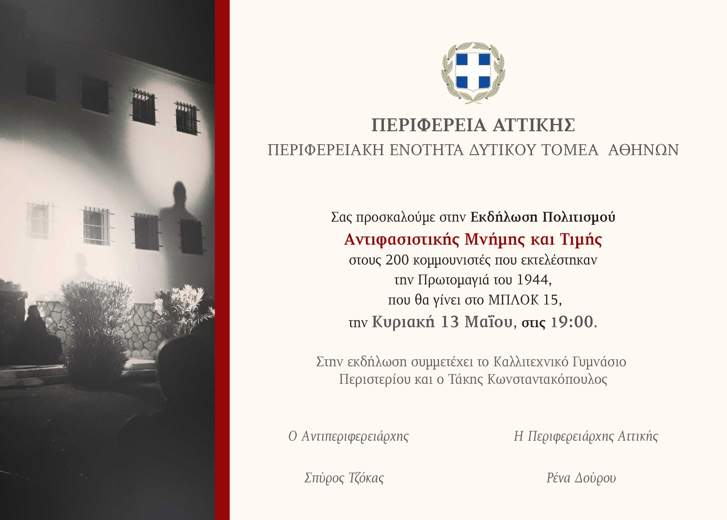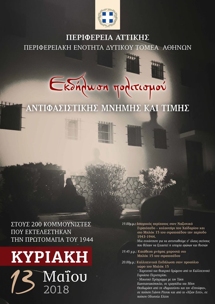 Με τη συμπλήρωση 74 χρόνων από την συνθηκολόγηση της ναζιστικής Γερμανίας και την λήξη του πολέμου στην Ευρώπη, τον Μάιο, τιμώντας και αναδεικνύοντας τη συμβολή των κατοίκων της Δυτικής Αθήνας στον αντιφασιστικό αγώνα μέσα από τις γραμμές της Εθνικής Αντίστασης, η Περιφέρεια Αττικής και η Περιφερειακή Ενότητα Δυτικής Αθήνας διοργανώνει την Κυριακή, 13 Μαΐου μία Ημέρα Πολιτισμού, Ιστορικής και Αντιφασιστικής Μνήμης που περιλαμβάνει: επίσκεψη και περιήγηση στο ιστορικό Μπλοκ 15 του στρατοπέδου του Χαϊδαρίου, κατάθεση στεφάνου και καλλιτεχνική εκδήλωση.