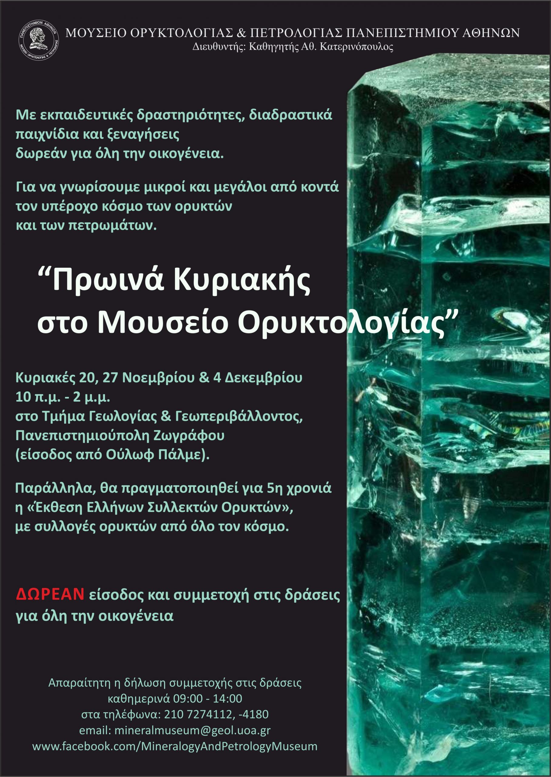 Είμαστε στην ευχάριστη θέση να σας ανακοινώνουσε πως το Μουσείο Ορυκτολογίας και Πετρολογίας ανοίγει τις Κυριακές 20 και 27 Νοεμβρίου και 4 Δεκεμβρίου 2016 και ώρες 10:00 – 14:00, στα πλαίσια της εκδήλωσης «Πρωινά Κυριακής στο Μουσείο Ορυκτολογίας», με νέες εκπαιδευτικές δραστηριότητες και ξεναγήσεις ΔΩΡΕΑΝ για όλη την οικογένεια.