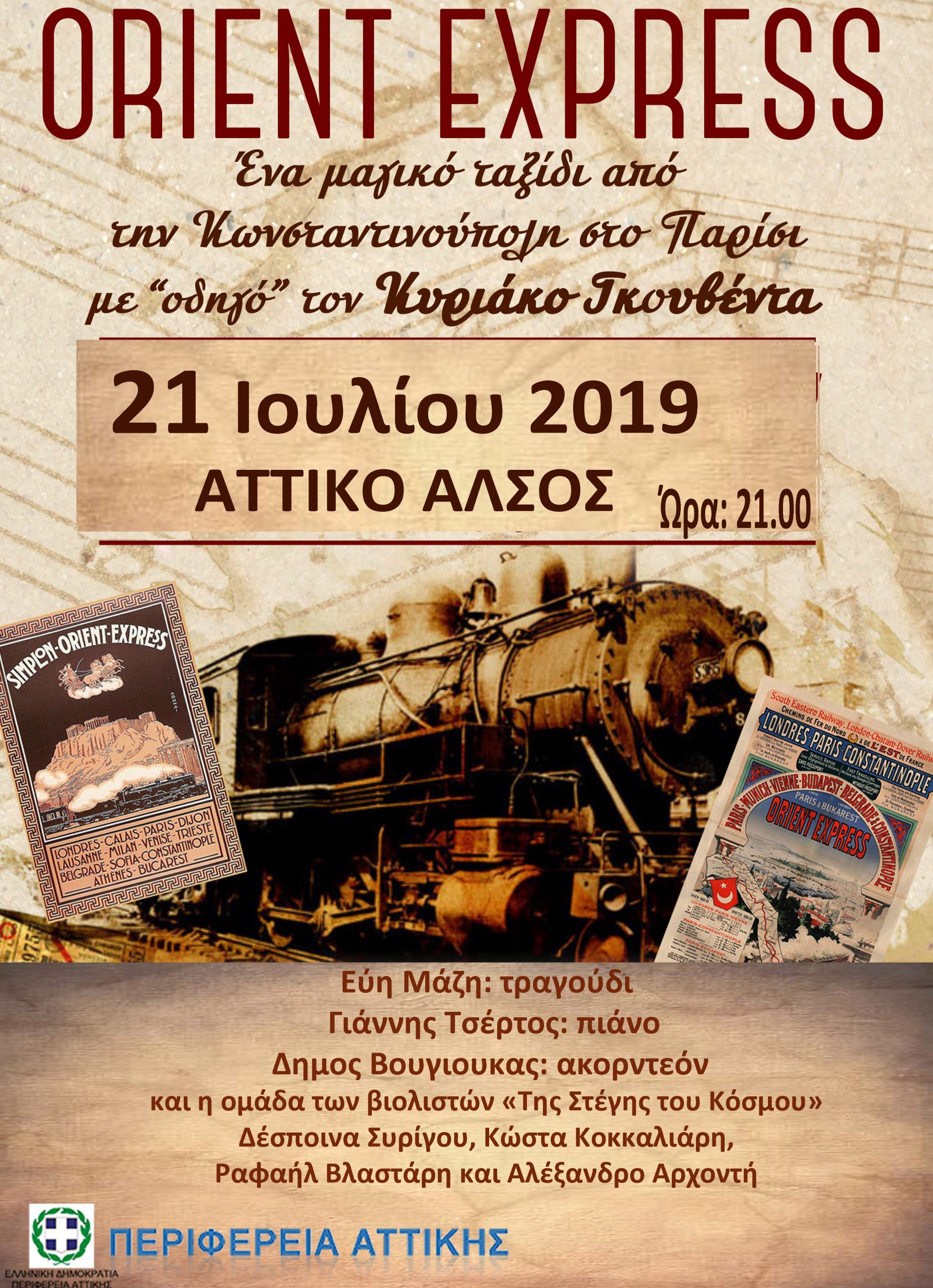190718 afisa orient express-smallΗ Περιφέρεια Αττικής σας προσκαλεί  σε ένα μουσικό μαγικό ταξίδι από την Κωνσταντινούπολη στο Παρίσι με το ORIENT EXPRESS” και “οδηγό” τον δεξιοτέχνη σολίστα Κυριάκο Γκουβέντα στο Αττικό Άλσος, την Κυριακή 21 Ιουλίου 2019 στις 21:00.