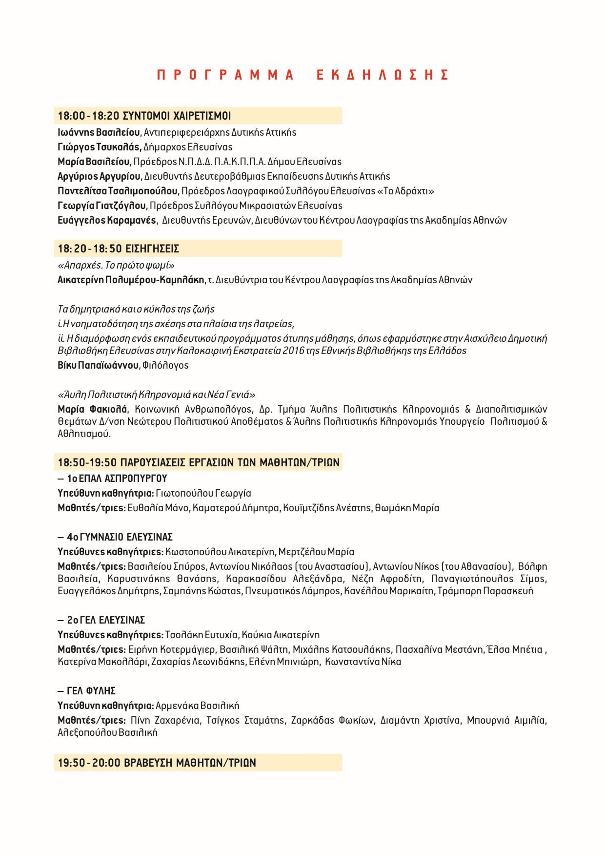 Η εκδήλωση- βράβευση οργανώνεται την Παρασκευή, 28 Απριλίου 2017, στις 6μμ στο Δημοτικό Μέγαρο Ελευσίνας (Χατζηδάκη και Δήμητρος).