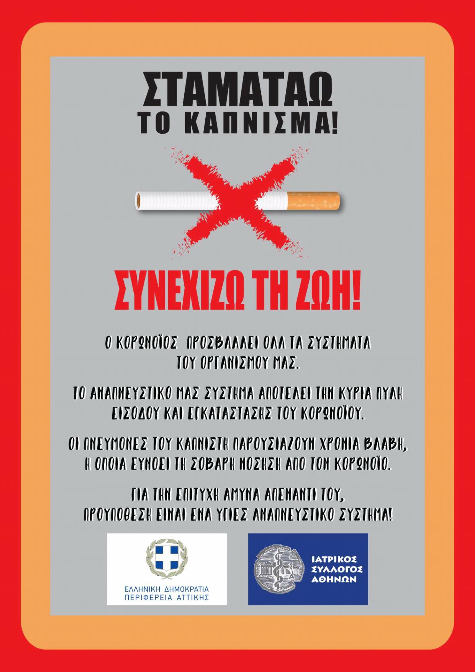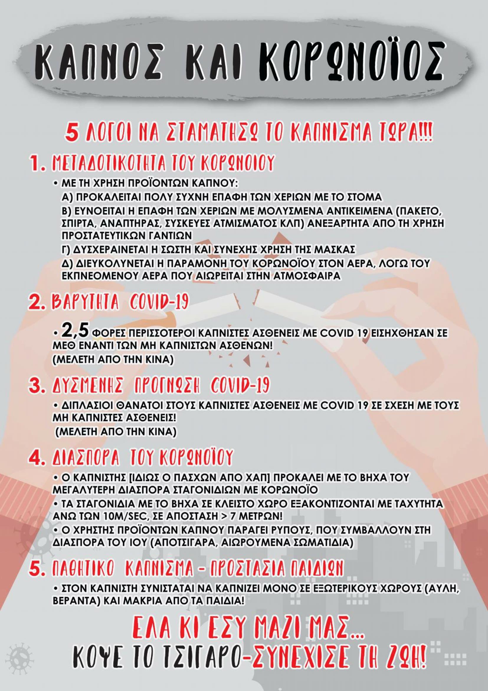 Το δεύτερο φυλλάδιο αναφέρεται στη σύνδεση του καπνίσματος με τις σοβαρές επιπλοκές της Covid-19 και καλεί τους πολίτες να διακόψουν το κάπνισμα.