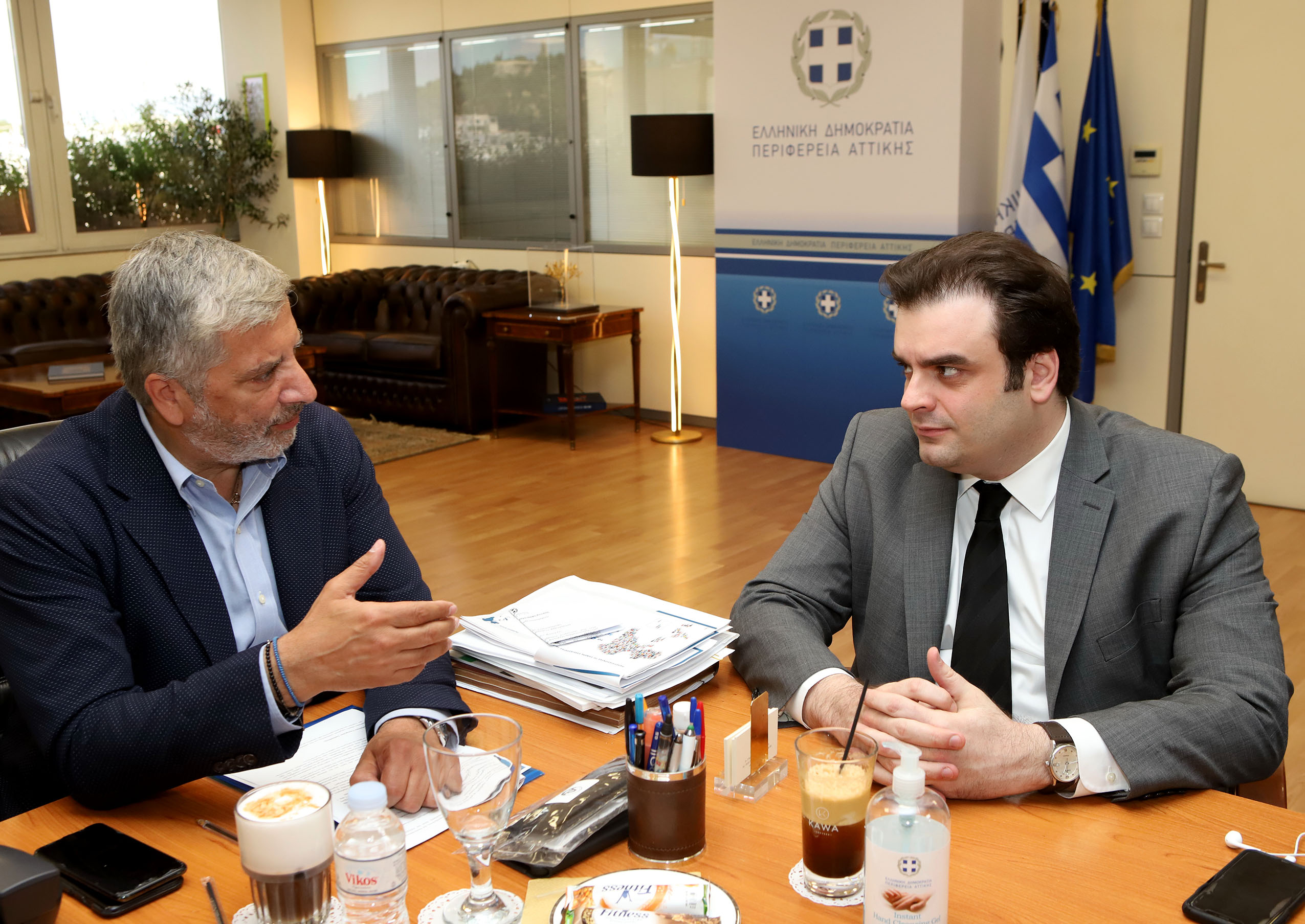 Η ενίσχυση και διεύρυνση της συνεργασίας μεταξύ της Περιφέρειας Αττικής με το υπ. Ψηφιακής Διακυβέρνησης στο πλαίσιο της διαδικασίας ψηφιακού μετασχηματισμού της Περιφέρειας που είναι σε εξέλιξη, ήταν το αντικείμενο της συνάντησης του Περιφερειάρχη Αττικής Γ. Πατούλη με τον υπ. Ψηφιακής Διακυβέρνησης Κ. Πιερρακάκη, στα γραφεία της Περιφέρειας.