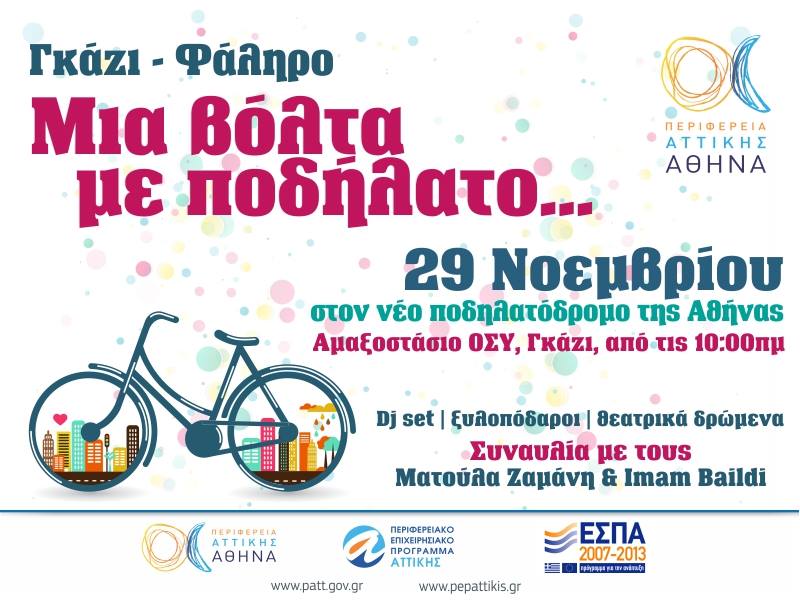 «Γκάζι – Φάληρο: Μια βόλτα με ποδήλατο», ονομάζεται η εκδήλωση για τους φίλους του ποδηλάτου  στο νέο ποδηλατόδρομο της Αθήνας (νότιο τμήμα) από την Τεχνόπολη ως το Δέλτα Φαλήρου, την οποία διοργανώνει η Περιφέρεια Αττικής την ερχόμενη Κυριακή 29 Νοεμβρίου στο Γκάζι. Πρόκειται για μια γιορτή για τους μικρούς και μεγάλους φίλους του ποδηλάτου που περιλαμβάνει αρχικά μια βόλτα με ποδήλατο με σημείο συνάντησης το Αμαξοστάσιο ΟΣΥ στο Γκάζι από τις 10:00 π.μ. Η εκδήλωση εντάσσεται στο πλαίσιο των δράσεων «Ποιότητα Ζωής» που αναπτύσσει η Περιφέρεια Αττικής για την προβολή και ανάδειξη έργων με χρηματοδότηση του ΠΕΠ Αττικής.