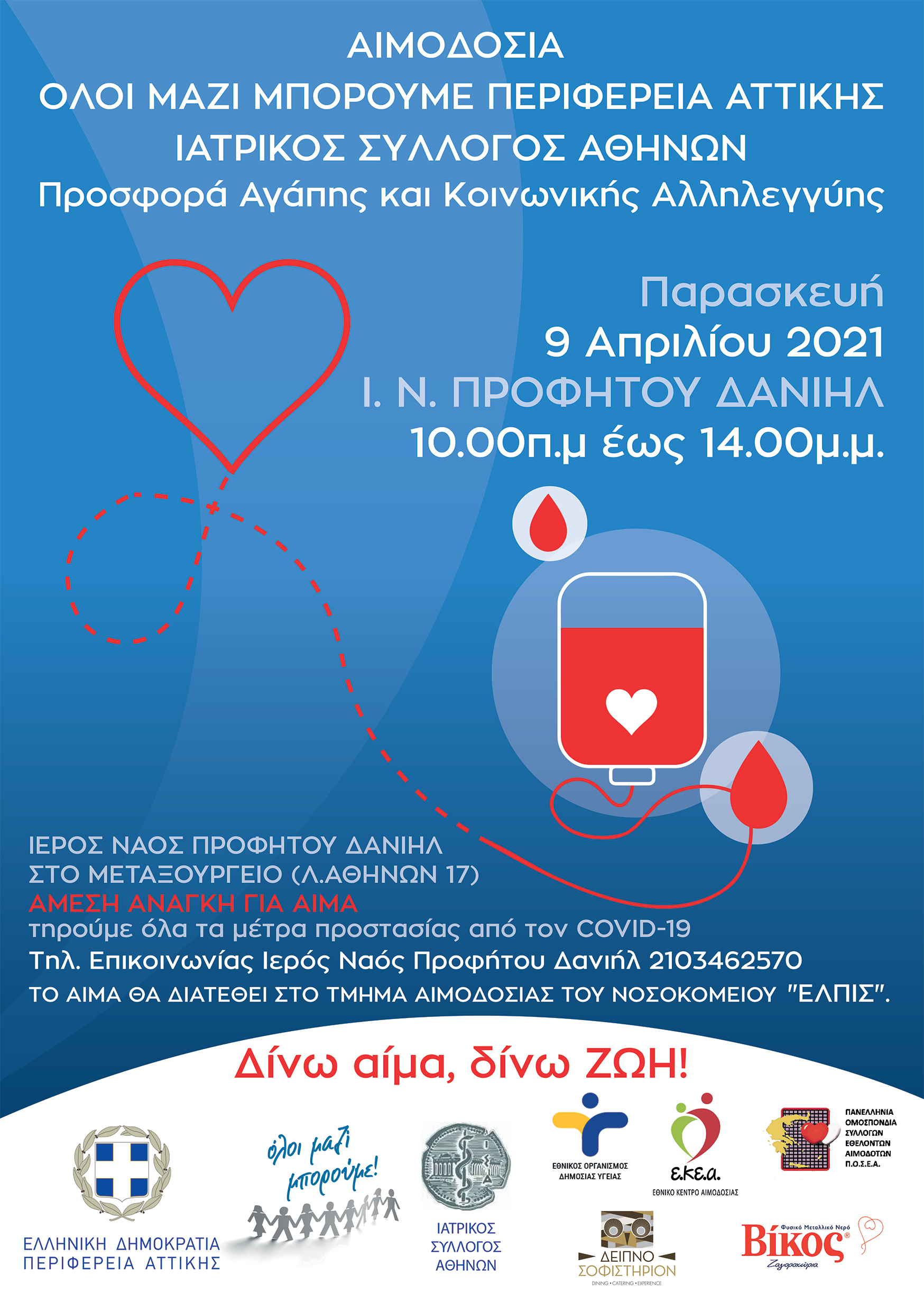 210408 aimodosiaΗ Περιφέρεια Αττικής σε συνεργασία με το «Όλοι Μαζί Μπορούμε» τον ΙΣΑ και τον Ιερό Ναό Προφήτου Δανιήλ, διοργανώνουν αύριο Παρασκευή 9 Απριλίου δράση Εθελοντικής Αιμοδοσίας για τη στήριξη των αναγκών του Νοσοκομείου «ΕΛΠΙΣ».
