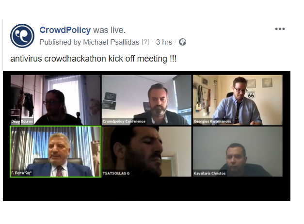 α. δίνοντας θέματα ή προβλήματα ή προκλήσεις για λύση, από τον χώρο της κοινωνίας, της υγείας, της επιχειρηματικότητας και της οικονομίας. Η καταγραφή πραγματοποιείται μέσα από ηλεκτρονική πλατφόρμα διαβούλευσης https://hello.crowdapps.net/crowdhackathon-antivirus/archive/ και ήδη έχουν καταγραφεί πάνω από 45 προτάσεις για υλοποίηση.