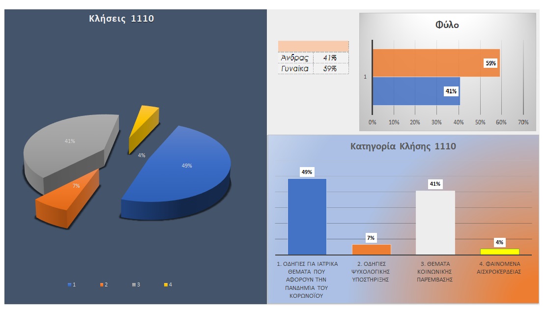 Σύμφωνα με τα πρόσφατα στατιστικά, ένας στους δύο πολίτες (48%) απευθύνεται στον τετραψήφιο αριθμό 1110 προκειμένου να ζητήσει πληροφορίες για ιατρικά θέματα. Επιπλέον ένα 7% ζητά οδηγίες για ψυχολογική υποστήριξη, ενώ το 41% απευθύνεται στο τηλεφωνικό κέντρο για θέματα κοινωνικής παρέμβασης.  Τέλος 3,8% καταγγέλλει φαινόμενα αισχροκέρδειας.
