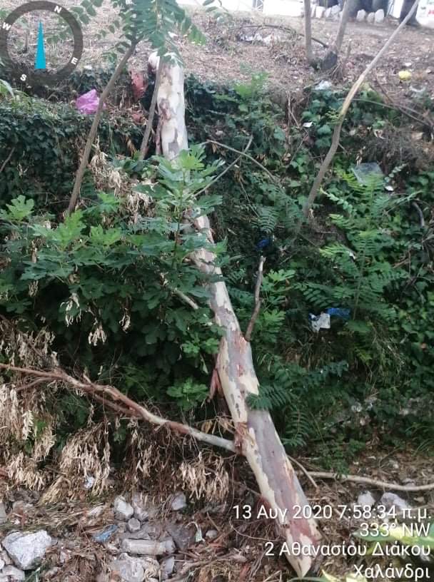 1.Ολοκλήρωσαν τον  καθαρισμό και την απομάκρυνση 2 πεσμένων μεγάλων δέντρων του ρέματος Χαλανδρίου από την οδό Θήρας έως την οδό Σικίνου του Δήμου Πεντέλης  και στην Αθανασίου Διάκου.