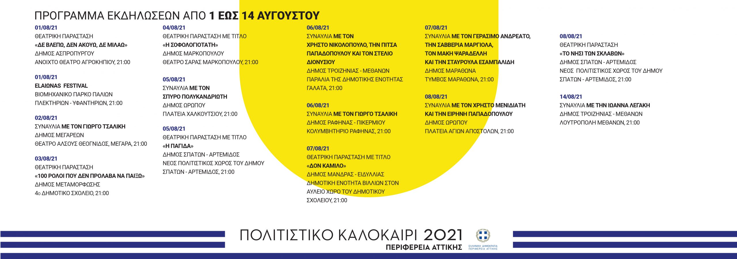 Στις 2 Αυγούστου ο Γιώργος Τσαλίκης δίνει συναυλία στο Θέατρο Άλσος Θεόγνιδος στα Μέγαρα στις 21:00, ενώ στις 3 Αυγούστου έρχεται η θεατρική παράσταση «100 Ρόλοι που δεν πρόλαβα να παίξω» στο 4ο Δημοτικό Σχολείο στη Μεταμόρφωση, στις 21:00 και στις 4 Αυγούστου η θεατρική παράσταση «η Σοφολογιοτάτη» στο Θέατρο Σάρας Μαρκοπούλου στο Μαρκόπουλο στις 21:00.