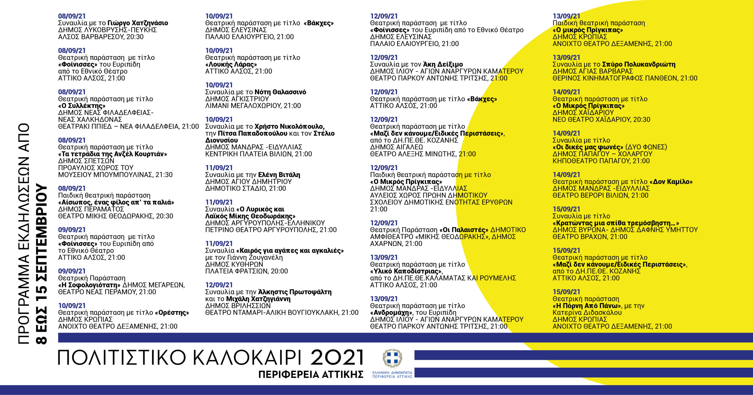 Από τις 8 Σεπτεμβρίου μέχρι σήμερα έχουν πραγματοποιηθεί η παρακάτω εκδηλώσεις: Μία συναυλία, τρεις θεατρικές παραστάσεις και μία παιδική απολαύσαν όσοι βρέθηκαν στις 8 Σεπτεμβρίου στο Άλσος Βαρβαρέσου του Δήμου Λυκόβρυσης-Πεύκης στις 20:30 με τον Γιώργο Χατζηνάσιο, στο Αττικό Άλσος στις 21:00 τις «Φοίνισσες» του Ευριπίδη από το Εθνικό Θέατρο, στο θεατράκι ΠΠΙΕΔ– Νέα Φιλαδέλφεια στις 21:00 τον «Συλλέκτη», στον προαύλιο χώρο του Μουσείου Μπουμπουλίνας στις Σπέτσες στις 21:30 «Τα τετράδια της Ανζέλ Κουρτιάν» και στις 20:30 στο θέατρο «Μίκης Θεοδωράκης» στο Πέραμα το παιδικό θεατρικό «Αίσωπος, ένας φίλος απ’ τα παλιά». Στις 9 Σεπτεμβρίου πραγματοποιήθηκαν δύο παραστάσεις στις 21:00: στο Αττικό Άλσος οι «Φοίνισσες» του Ευριπίδη από το Εθνικό Θέατρο και «Η Σοφολογιότατη» στο θέατρο Νέας Περάμου του Δήμου Μεγαρέων.