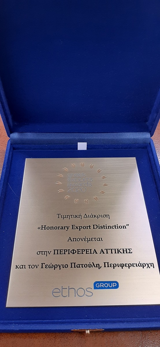 Ο Περιφερειάρχης Αττικής Γ. Πατούλης στο πλαίσιο του Greek Exports Forum και Awards 2020 έλαβε την τιμητική διάκριση (Honorary Export Distinction) για την συμβολή του στην ανάπτυξη της εξωστρέφειας των δραστηριοτήτων της επιχειρηματικής κοινότητας της Αττικής.