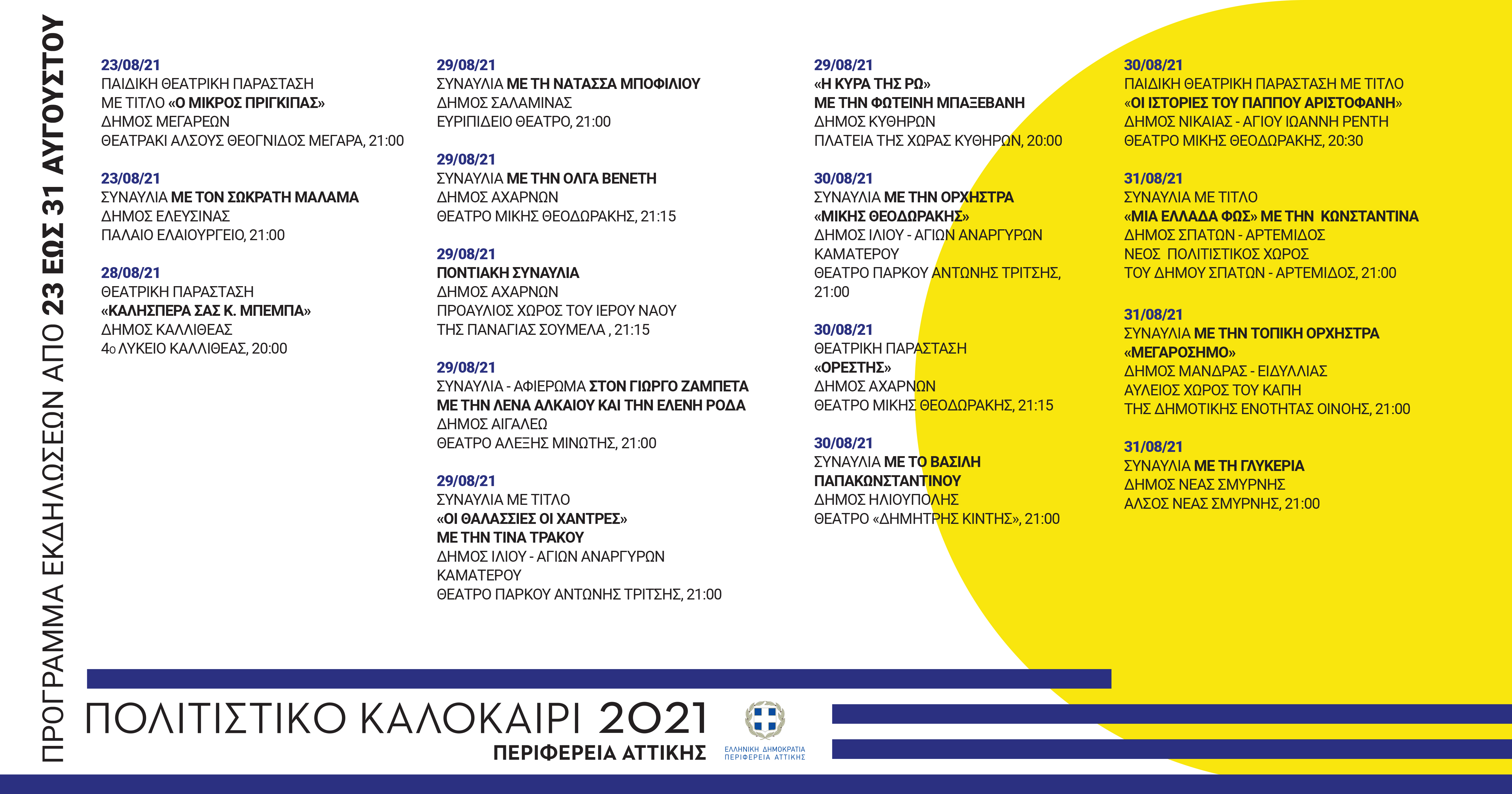 Με τρεις συναυλίες κλείνει ο Αύγουστος. Στις 31 του μήνα, στις 21:00, «Μια Ελλάδα Φως» με την Κωνσταντίνα στο Νέο Πολιτιστικό Χώρο του Δήμου Σπάτων-Αρτέμιδος, συναυλία με την τοπική ορχήστρα «Μεγαρόσημο» στον αύλειο χώρο του ΚΑΠΗ της Δημοτικής Ενότητας Οινόης του Δήμου Μάνδρας – Ειδυλλίας και η Γλυκερία στο Άλσος της Νέας Σμύρνης.
