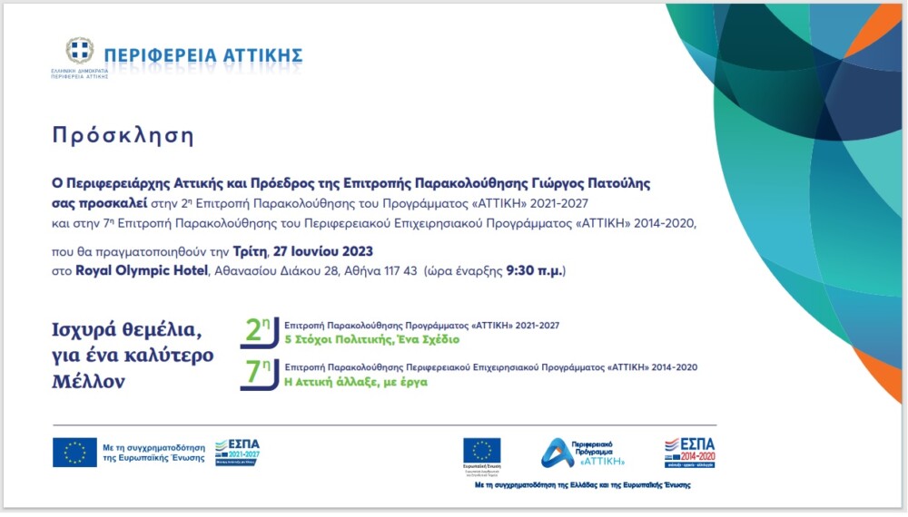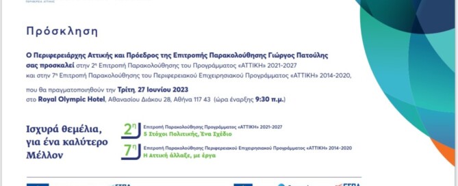 Γ. Πατούλης: «H Αττική άλλαξε, µε έργα. Με συγκεκριμένους στόχους και σχέδιο βάζουμε ισχυρά θεμέλια για ένα καλύτερο μέλλον» Ο Περιφερειάρχης Αττικής και Πρόεδρος της Επιτροπής Παρακολούθησης Γιώργος Πατούλης προσκαλεί τα μέλη των επιτροπών και τους πολίτες στη 2η Επιτροπή Παρακολούθησης του Προγράμματος «ΑΤΤΙΚΗ» 2021-2027 και την 7η Επιτροπής Παρακολούθησης του Περιφερειακού Επιχειρησιακού Προγράμματος