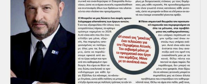 Συνέντευξη του Περιφερειάρχη Αττικής στην εφημερίδα Political Στις πρόσφατες αλλαγές στο διοικητικό σχήμα της περιφερειακής αρχής, την υλοποίηση μεγάλων έργων υποδομής σε όλο το Λεκανοπέδιο, με εξασφαλισμένους πόρους και σαφή χρονοδιαγράμματα, την προτεραιοποίηση παρεμβάσεων που έχουν ανάγκη οι τοπικές κοινωνίες, με έμφαση στην προστασία από τις συνέπειες της κλιματικής κρίσης, καθώς και στα προσωπικά του