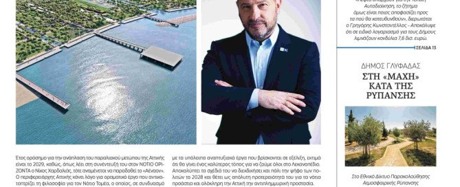 Συνέντευξη του Περιφερειάρχη Αττικής στην εφημερίδα «Νότιος Ορίζοντας» Στην προτεραιοποίηση έργων ουσίας που βελτιώνουν την καθημερινότητα των πολιτών, στην ανάπλαση του παραλιακού μετώπου, στις μεγάλες αυτοδιοικητικές προκλήσεις όπως η αντιπλημμυρική θωράκιση και η διαχείριση του κυκλοφοριακού, αλλά και στη σταθερή του πρόθεση να θέσει εκ νέου υποψηφιότητα το 2028, αναφέρθηκε ο Περιφερειάρχης Αττικής