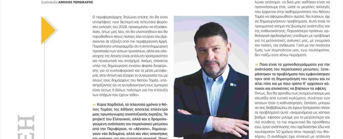 Συνέντευξη του Περιφερειάρχη Αττικής στην εφημερίδα «Νότιος Ορίζοντας» Στην προτεραιοποίηση έργων ουσίας που βελτιώνουν την καθημερινότητα των πολιτών, στην ανάπλαση του παραλιακού μετώπου, στις μεγάλες αυτοδιοικητικές προκλήσεις όπως η αντιπλημμυρική θωράκιση και η διαχείριση του κυκλοφοριακού, αλλά και στη σταθερή του πρόθεση να θέσει εκ νέου υποψηφιότητα το 2028, αναφέρθηκε ο Περιφερειάρχης Αττικής
