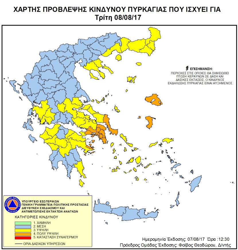 Σύμφωνα με τον επισυναπτόμενο Χάρτη Πρόβλεψης Κινδύνου Πυρκαγιάς που εξέδωσε σήμερα Δευτέρα 7-8-2017 η Γενική Γραμματεία Πολιτικής Προστασίας (Γ.Γ.Π.Π.), για αύριο, Τρίτη 8 Ιουλίου 2017, προβλέπεται πολύ υψηλός ο κίνδυνος εκδήλωσης πυρκαγιάς (κατηγορία κινδύνου 4) σε περιοχές της Περιφέρειας Αττικής.