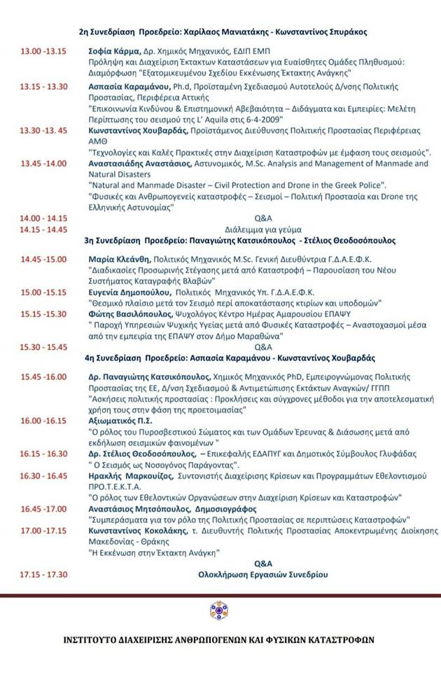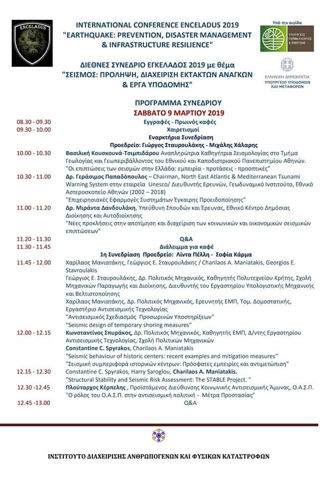 Συμμετοχή στο επιστημονικό συνέδριο Εγκέλαδος 2019 με θέμα “Σεισμός: Πρόληψη, Διαχείριση Εκτάκτων Αναγκών και Έργα Υποδομής» είχαν εκπρόσωποι της Αυτοτελούς Διεύθυνσης Πολιτικής Προστασίας που έγινε στην Αθήνα στις 9 Μαρτίου 2019. Συγκεκριμένα η Αν. Προϊστάμένη του Τμήματος Σχεδιασμού συμμετείχε με παρουσιάση στο συνέδριο με θέμα “Επικοινωνία Κινδύνου και Επιστημονική Αβεβαιότητα- Διδάγματα και Εμπειρίες: Μελέτη της περίπτωσης του Σεισμού της L’ Aquila στις 6-4-2009. Επίσης το σεμινάριο παρακαλούθουσαν και στελέχοι της Διεύθυνσης.
