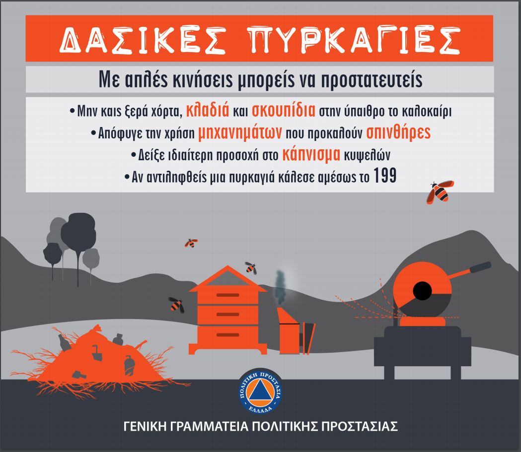 Συνιστάται στους πολίτες και στους επαγγελματίες να είναι ιδιαίτερα προσεκτικοί, να αποφεύγουν ενέργειες στην ύπαιθρο που μπορούν να προκαλέσουν πυρκαγιά από αμέλεια, όπως η ρίψη αναμμένων τσιγάρων, το κάψιμο ξερών χόρτων και κλαδιών ή υπολειμμάτων καθαρισμού, η χρήση μηχανημάτων που προκαλούν σπινθήρες όπως δισκοπρίονα, συσκευές συγκόλλησης, η χρήση υπαίθριων ψησταριών κ.α.. Επίσης, υπενθυμίζεται ότι κατά τη διάρκεια της αντιπυρικής περιόδου απαγορεύεται η καύση των αγρών.
