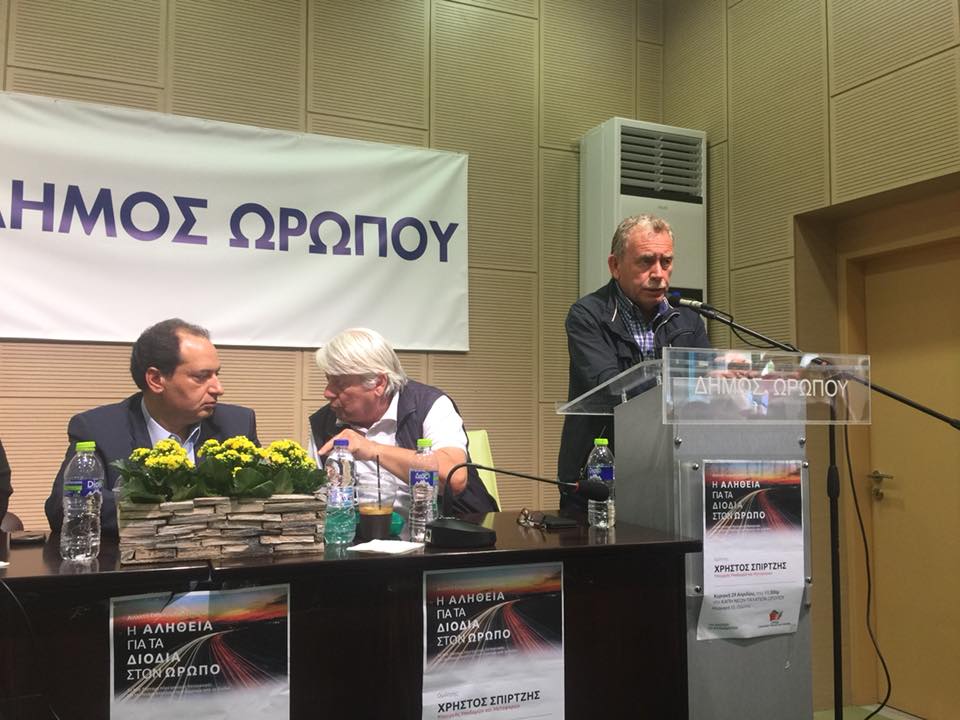 Εκδήλωση για το θέμα των διοδίων (διέλευση, απαλλαγές κατοίκων κλπ) διοργάνωσαν την Κυριακή 29 Απριλίου στον Ωρωπό, οι Οργανώσεις Μελών ΣΥΡΙΖΑ Καπανδριτίου και Ωρωπού με ομιλητή τον Υπουργό Υποδομών και Μεταφορών Χρήστο Σπίρτζη. Ο υπουργός ανακοίνωσε ότι οι κάτοικοι του Δήμου Ωρωπού και της ευρύτερης περιοχής μετά την ολοκλήρωση της ηλεκτρονικής καταγραφής των αυτοκινήτων τους, σε λίγους μήνες, θα απαλλαγούν από την πληρωμή των πλευρικών διοδίων. Ο κ. Σπίρτζης εξήγησε στους κατοίκους της περιοχής ότι είναι πολύ δύσκολο να καταργηθούν τα διόδια, επισήμανε όμως ότι το νέο ηλεκτρονικό σύστημα διοδίων θα είναι δίκαιο και πιο αναλογικό για τους πολίτες.