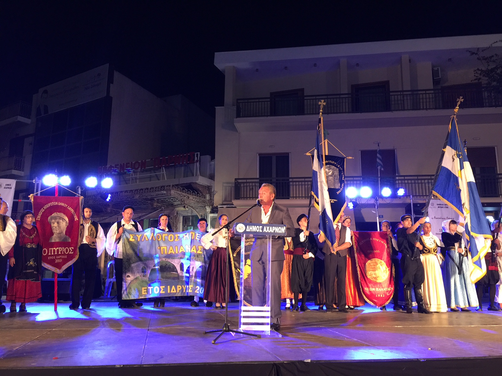 Σύντομο χαιρετισμό απεύθυνε και ο Δήμαρχος Αχαρνών Γιάννης Κασσαβός, ο οποίος μίλησε για την άρρηκτη σχέση του ελληνικού πολιτισμού με τον χορό και επισήμανε ότι με τη συγκεκριμένη εκδήλωση αναδεικνύονται τα «εργαλεία» που χρησιμοποιούν όσοι ασχολούνται με συλλόγους, όπως είναι το μεράκι, το κέφι και η αγάπη για τον κάθε τόπο.
