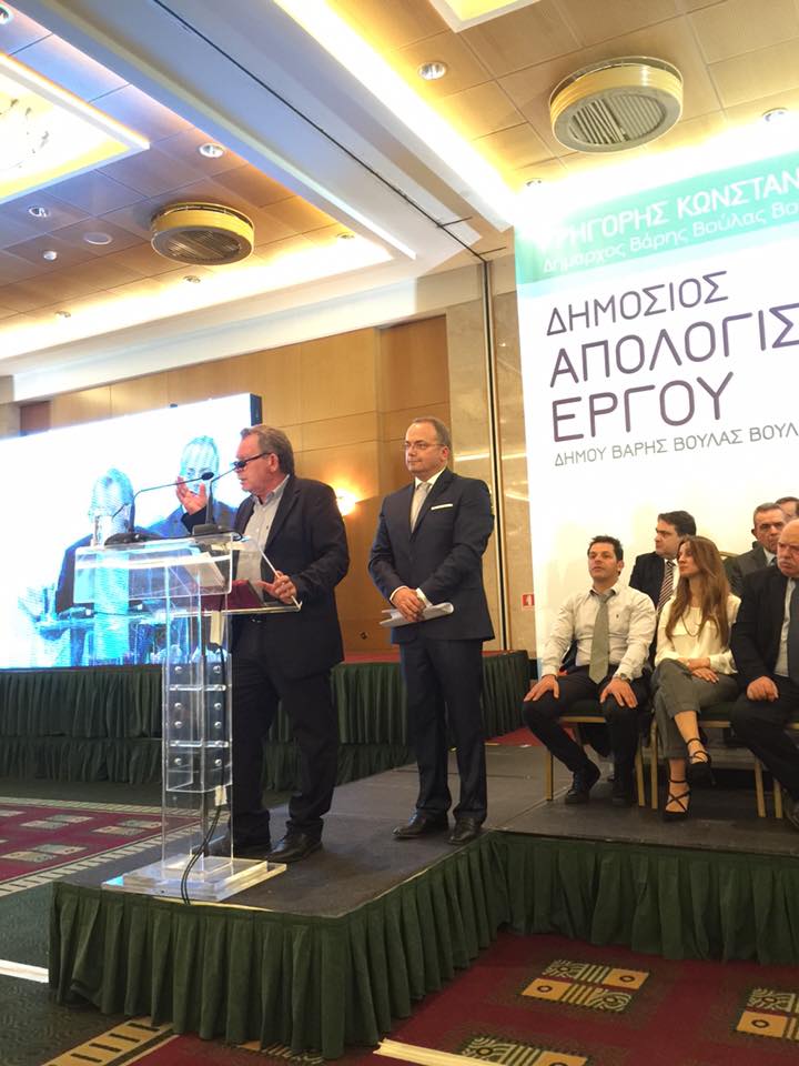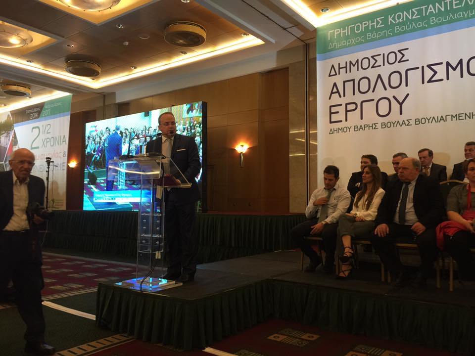 Στην κατάμεστη αίθουσα γνωστού ξενοδοχείου της Βούλας έκανε τον απολογισμό δράσης των πρώτων 2,5 ετών της θητείας του ο Δήμαρχος Βάρης Βούλας Βουλιαγμένης Γρηγόρης Κωνσταντέλλος. Στον απολογισμό του ο Δήμαρχος έκανε ιδιαίτερη αναφορά στην Περιφέρεια Αττικής και στη μέχρι σήμερα συνεργασία των δύο πλευρών στη χρηματοδότηση των έργων υποδομής του δήμου.