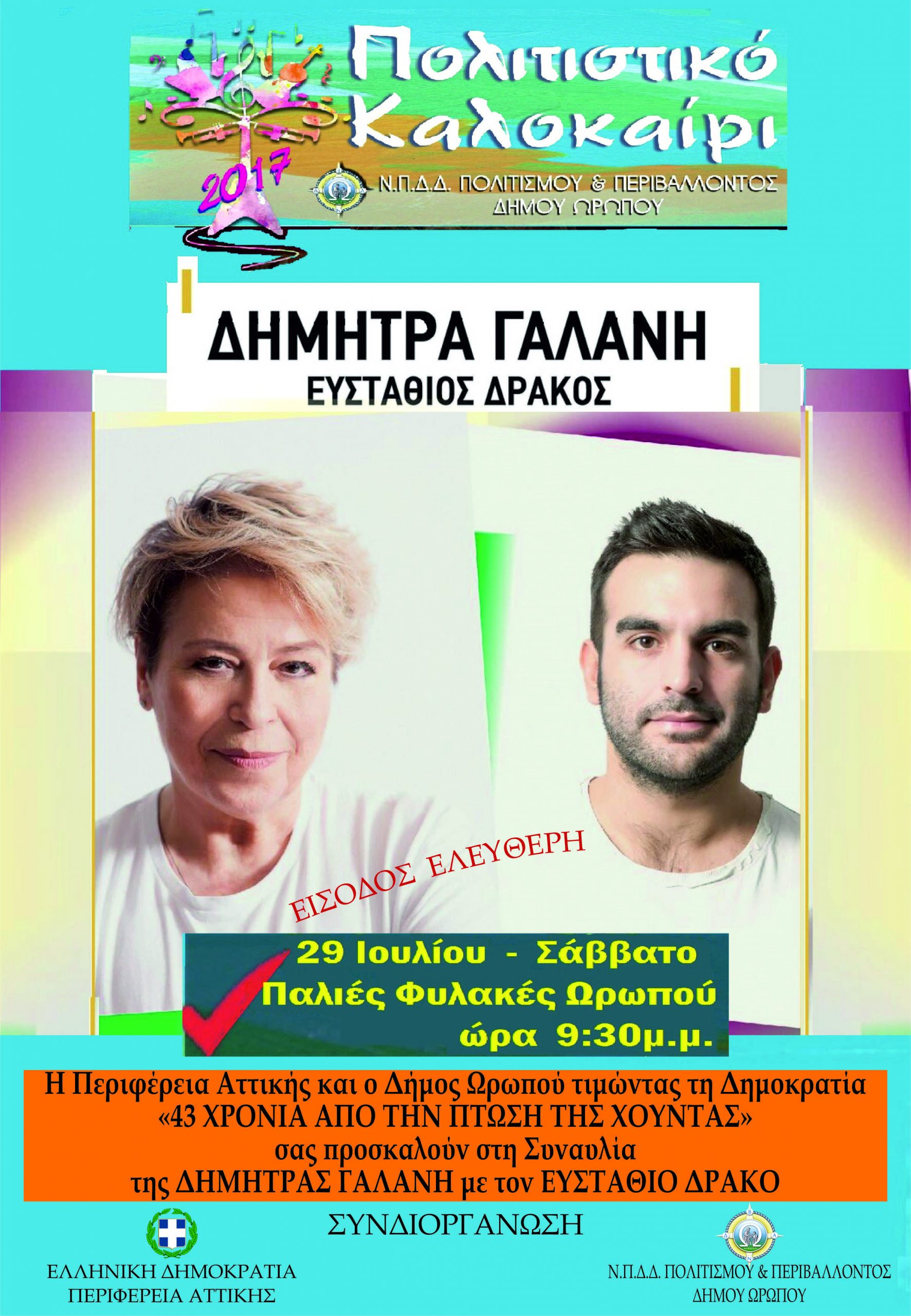 Το Σάββατο 29 Ιουλίου, στις 21:30, στις Παλιές Φυλακές Ωρωπού η Περιφέρεια Αττικής και ο Δήμος Ωρωπού συνδιοργανώνουν συναυλία για την 43η επέτειο αποκατάστασης της Δημοκρατίας, με τη σπουδαία ερμηνεύτρια Δήμητρα Γαλάνη. Στη συναυλία μετέχει ο συνθέτης και ερμηνευτής Ευστάθιος Δράκος καθώς και οι μουσικοί: Σεραφείμ Γιαννακόπουλος, Μηνάς Λιάκος, Θωμάς Κωνσταντίνου, Σπύρος Μάνεσης, Στέλιος Προβής.