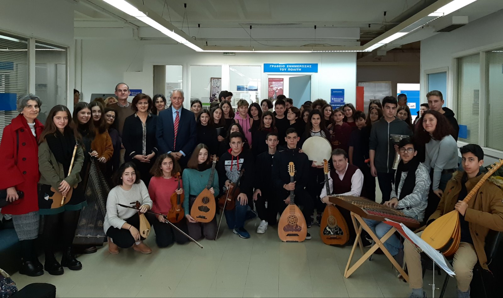 Ο Αντιπεριφερειάρχης Ανατολικής Αττικής Θανάσης Αυγερινός μαζί με τη σύζυγό του, Ελευθερία Φεργαδιώτη, και υπαλλήλους της Περιφερειακής Ενότητας είχαν τη χαρά να υποδεχθούν σήμερα την χορωδία παραδοσιακής μουσικής των παιδιών του Μουσικού Σχολείου Παλλήνης συνοδευόμενα από τον Διευθυντή του σχολείου και καθηγητές τους και να ψάλλουν όλοι μαζί τα κάλαντα των Χριστουγέννων.