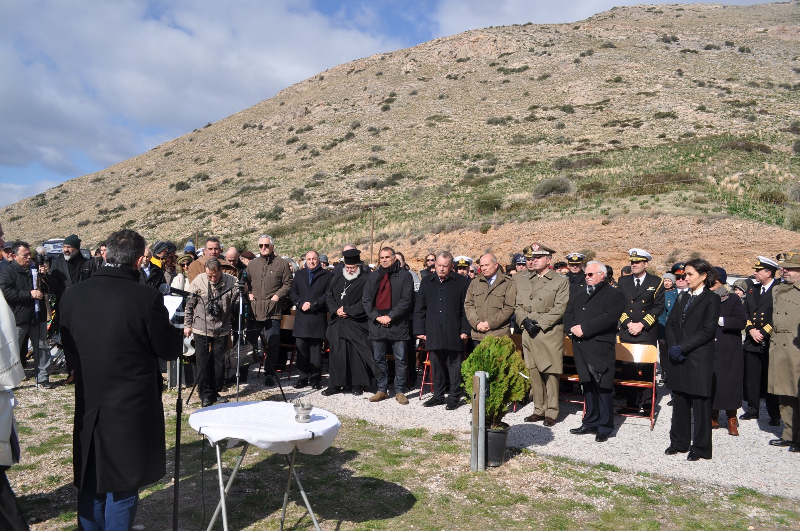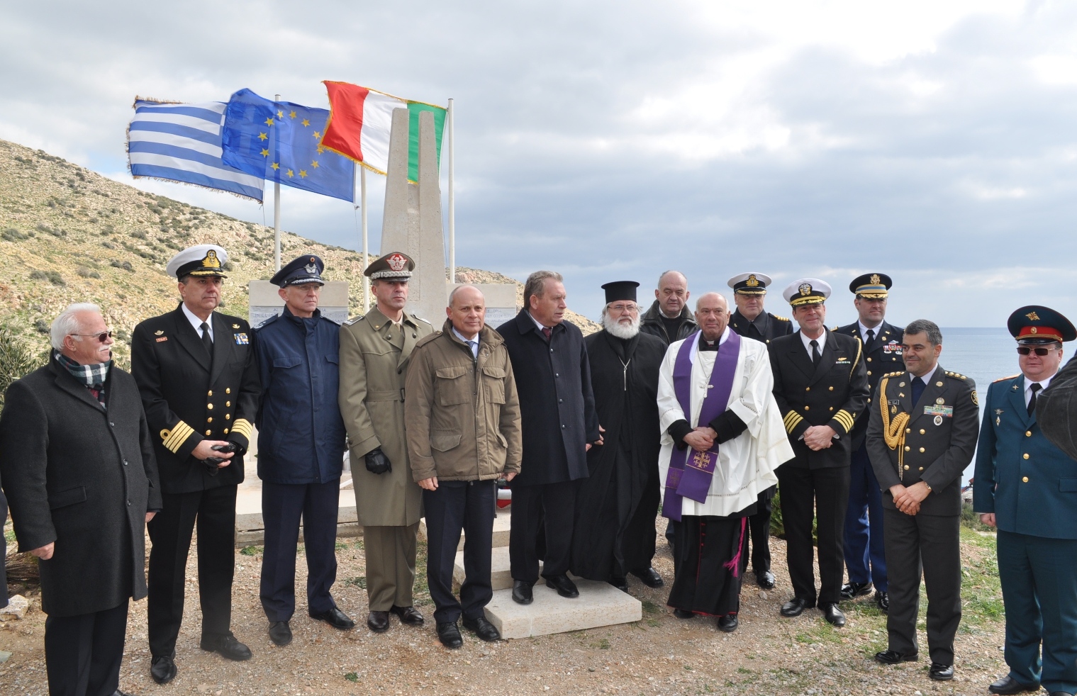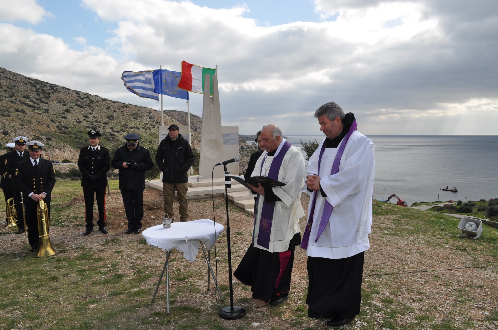 Στην τελετή όπου χοροστάτησε ο Σεβασμιότατος Αρχιεπίσκοπος των Καθολικών της Αθήνας π. Σεβαστιανός Ροσσολάτος, παραβρέθηκαν επίσης ο Εφημέριος του Ενοριακού Ιερού Καθολικού Ναού Αγίας Βαρβάρας στο Λαύριο π. Cristian Gaşpal, ο Πρωτοπρεσβύτερος Κυριάκος Μπίρης από τον Ι.Ν. Αγίας Ειρήνης Παλαιάς Φώκαιας εκπροσωπώντας τον Σεβασμιότατο Μητροπολίτη Μεσογαίας και Λαυρεωτικής κ.κ. Νικόλαο, ο Πρέσβης της Ιταλίας Luigi Efisio Marras, ο εκπρόσωπος του Αρχηγού Αμύνης της Ιταλίας Ταξίαρχος Vittorio Stella, καθώς και Στρατιωτικοί Ακόλουθοι της Γερμανίας (Συνταγματάρχης Ulrich Pfeiffer), της Ρωσίας (Συνταγματάρχης Sergey Demianov), του Ηνωμένου Βασιλείου (Πλοίαρχος Richard Blackwell) , των ΗΠΑ (Πλοίαρχος Robert Palm) και του Ιράν, εκ μέρους του ΥΕΘΑ και του Πολεμικού μας Ναυτικού ο Πλοίαρχος Βασίλειος Ευσταθίου, ο Αντιπεριφερειάρχης Ανατολικής Αττικής Πέτρος Φιλίππου και ο Περιφερειακός Σύμβουλος Αττικής Θεόδωρος Αγγελόπουλος, ο Δήμαρχος Λαυρεωτικής Δημήτρης Λουκάς, οι Αντιδήμαρχοι Σαρωνικού Ηλίας Μπουκοβάλας και Σπύρος Δημητρίου, δημοτικοί και τοπικοί σύμβουλοι των δύο δήμων, ο Δήμαρχος Κορωπίου Δημήτρης Κιούσης, ο πρόεδρος της Χρυσής Τομής Σταμάτης Παπαθανασίου και μέλη του Συνδέσμου, μαθητές της Ιταλικής Σχολής, εκπρόσωποι της Επιτροπής των Ιταλών του εξωτερικού και Ιταλικών Ενώσεων, ο δύτης – ερευνητής Αριστοτέλης Ζερβούδης που πρώτος ανακάλυψε ευρήματα του ναυαγίου καθώς και εκπρόσωποι τοπικών συλλόγων και φορέων αλλά και κάτοικοι της ευρύτερης περιοχής.