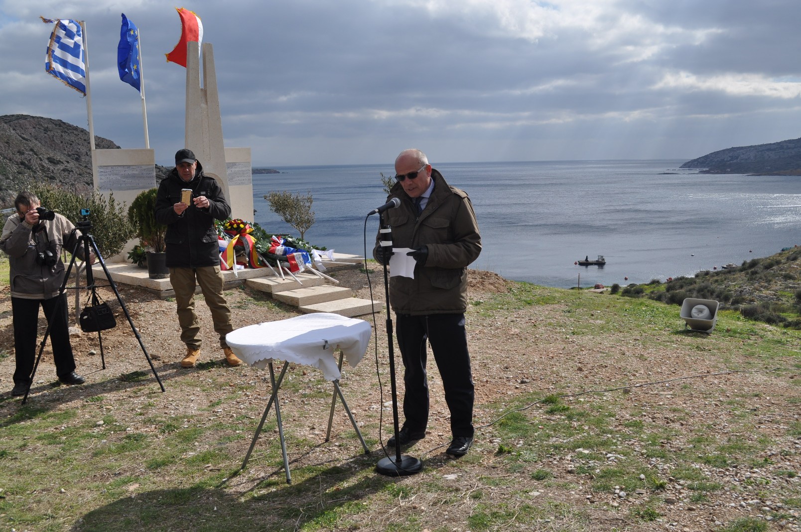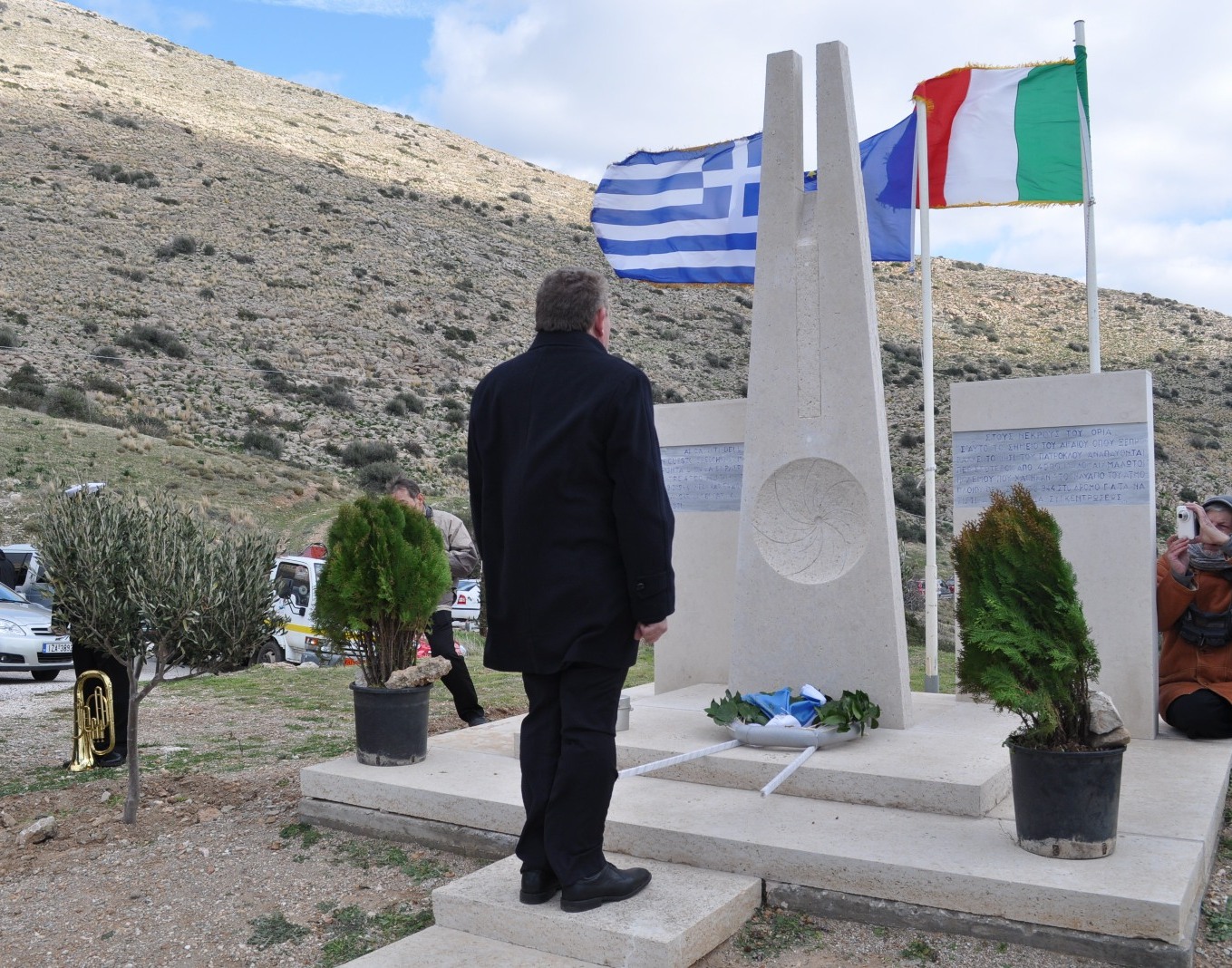 Μετά το πέρας της επιμνημόσυνης δέησης, ακολούθησε κατάθεση στεφάνων στο μνημείο που έχει στηθεί στο σημείο για τα θύματα του ναυαγίου, το οποίο φιλοτέχνησε ο γλύπτης Θύμιος Πανουργιάς, ανάκρουση του ιταλικού και του ελληνικού εθνικού ύμνου από τη Φιλαρμονική του Πολεμικού Ναυτικού και σύντομες ομιλίες από τον Αντιπεριφερειάρχη κ. Φιλίππου, τον αξιότιμο πρέσβη της Ιταλίας κ. Marras και τον πρόεδρο της Χρυσής Τομής κ. Παπαθανασίου.