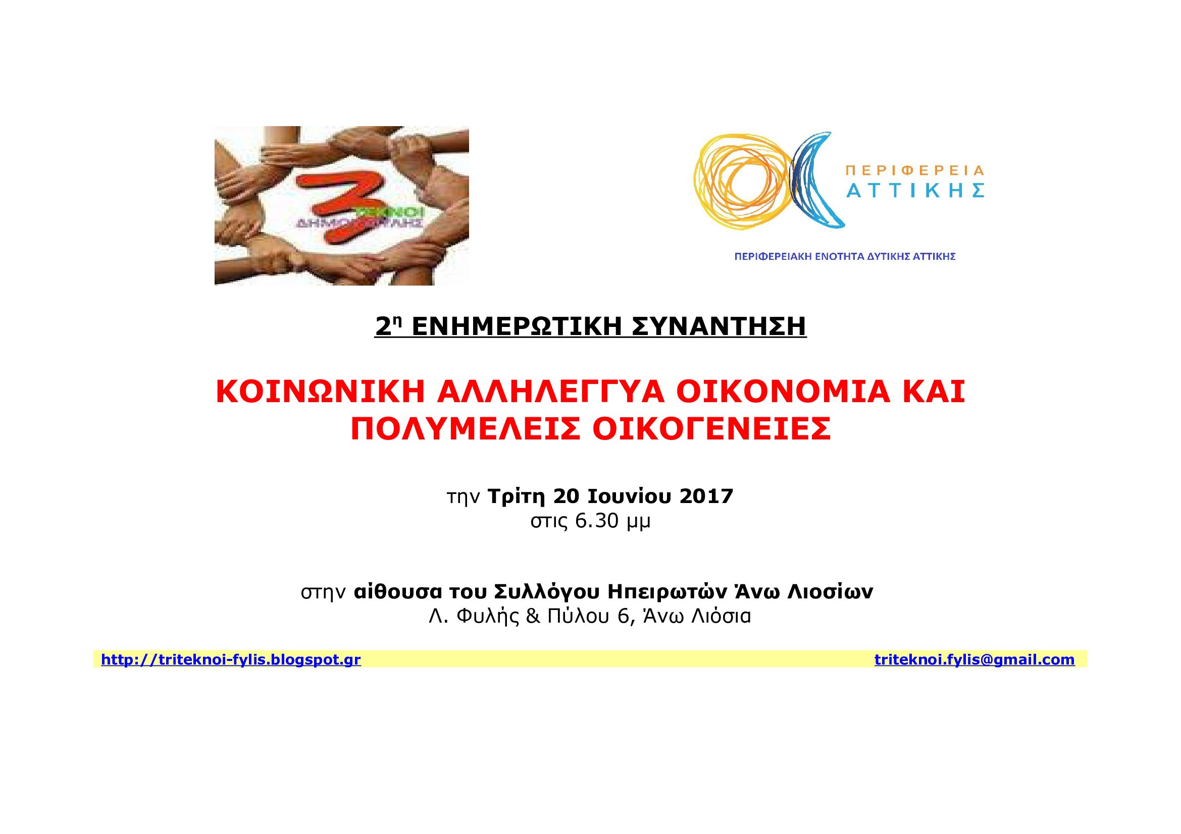 Η Περιφέρεια Αττικής/Περιφερειακή Ενότητα Δυτικής Αττικής στηρίζει την 2η ενημερωτική συνάντηση για την κοινωνική και αλληλέγγυα οικονομία που διοργανώνεται από τον Σύλλογο Τριτέκνων Φυλής, την Τρίτη 20 Ιουνίου, στις 6.30μμ στα Άνω Λιόσια (Λ. Φυλής & Πύλου 6, αίθουσα του Συλλόγου Ηπειρωτών Άνω Λιοσίων).