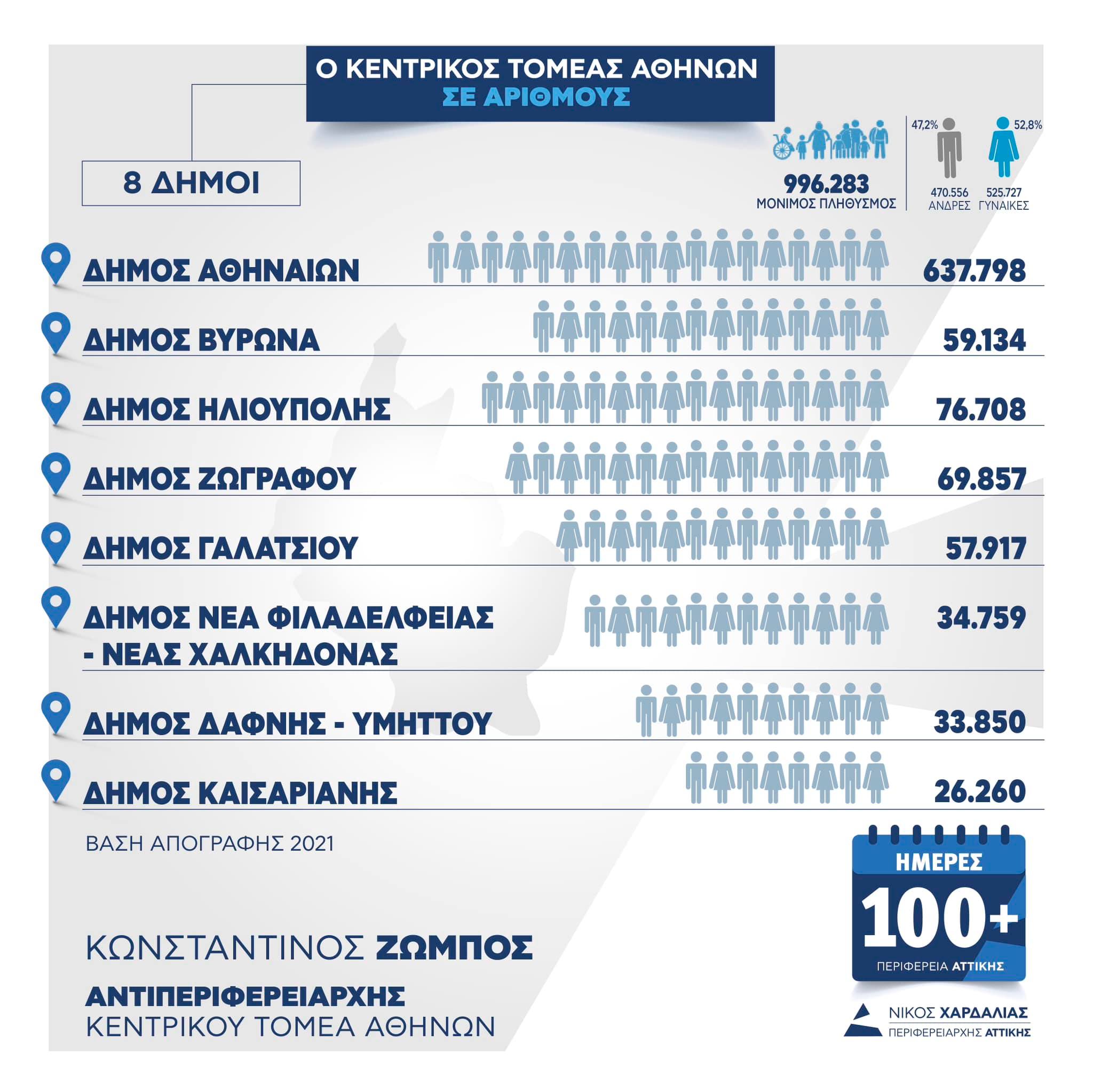 Ο Κεντρικός Τομέας Αθηνών, μία από τις πιο σημαντικές περιφερειακές ενότητες της Αττικής, συνεχίζει να είναι ο κινητήριος μοχλός για την ανάπτυξη και την ευημερία της Περιφέρειας Αττικής, με σημαντικό ρόλο στην ελληνική οικονομία και κοινωνία. Σύμφωνα με τα στοιχεία της απογραφής του 2021 από την ΕΛ.ΣΤΑΤ., ο μόνιμος πληθυσμός της περιοχής ανέρχεται σε 1.002.212 κατοίκους, ενώ περισσότερα από 2,4 εκατομμύρια άτομα εργάζονται στους 8 δήμους που τη συγκροτούν.