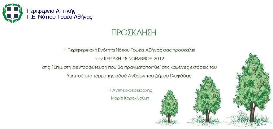 Η Περιφερειακή Ενότητα Νότιας Αθήνας προσκαλεί μικρούς και μεγάλους να πάρουν μέρος σε δενδροφύτευση στις καμένες εκτάσεις του Υμηττού στο τέρμα της οδού Ανθέων στην Άνω Γλυφάδα την Κυριακή 18 Νοεμβρίου και ώρα 10:00.