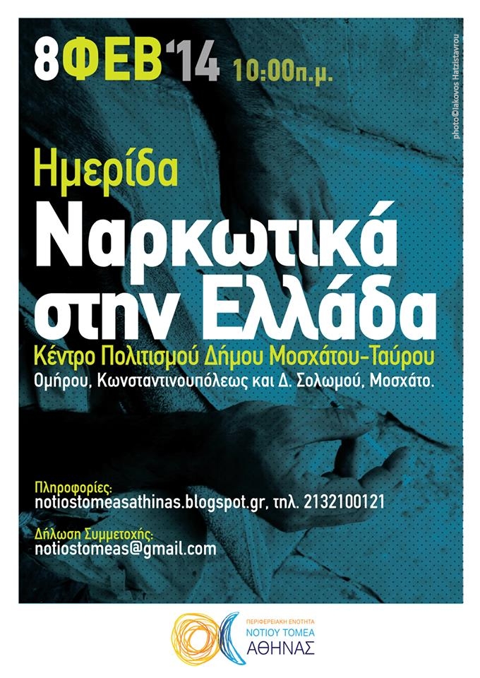 Η Περιφερειακή Ενότητα Νοτίου Τομέα Αθήνας διοργανώνει στις 8 Φεβρουαρίου 2014, Ημερίδα με θέμα «Τα Ναρκωτικά στην Ελλάδα» στο αμφιθέατρο του Κέντρου Πολιτισμού του Δήμου Μοσχάτου-Ταύρου (Ομήρου, Κωνσταντινουπόλεως και Δ. Σολωμού) στο Μοσχάτο.