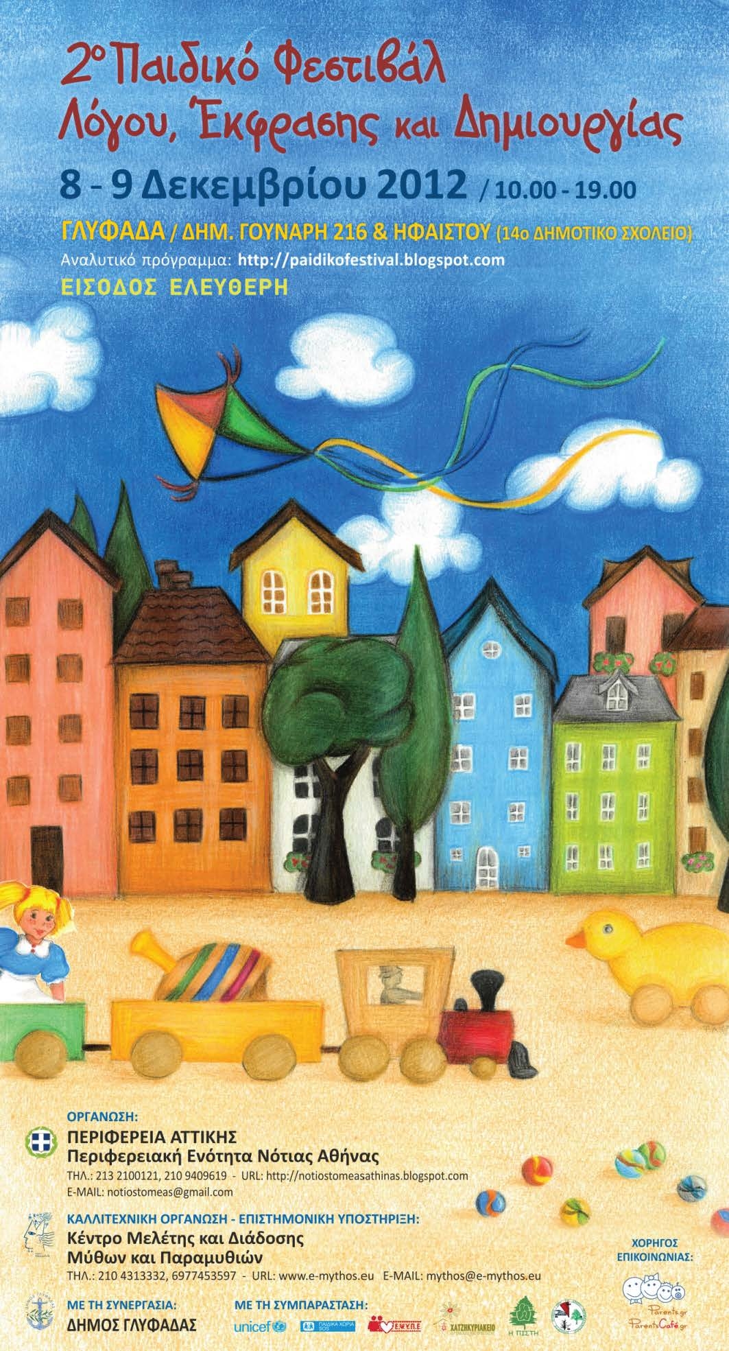 Η Περιφερειακή Ενότητα Νότιας Αθήνας με αφορμή την παγκόσμια ημέρα του Παιδιού (11/12), διοργανώνει για δεύτερη συνεχή χρονιά το «Παιδικό Φεστιβάλ Λόγου, Έκφρασης και Δημιουργίας» το Σάββατο 8 και την Κυριακή 9 Δεκεμβρίου 2012 (10.00 – 19.00), στο Δήμο Γλυφάδας (14ο Δημοτικό σχολείο Γλυφάδας) με την καλλιτεχνική οργάνωση και επιστημονική υποστήριξη του Κέντρου Μελέτης και Διάδοσης Μύθων και Παραμυθιών.